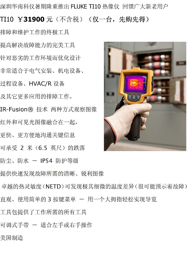 福禄克Fluke Ti10红外热像仪是进步解决故障能力的完美工具。福禄克Ti10红外热像仪这款高机能、全辐射成像仪专门针对恶劣的工作环境而优化设计,非常适合于电气安装、机电设备、过程设备、HVAC/R设备及其它更多应用的排障工作。