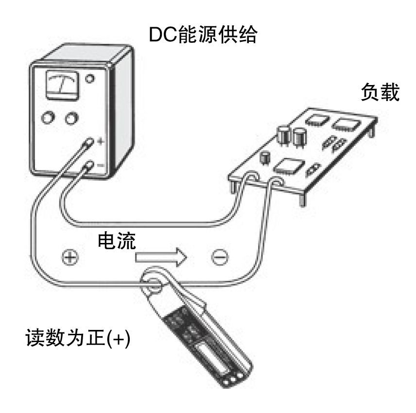 与交流电流测试交流电一样,用钳头夹住被测物,在直流电流测试中,当钳形电流表的电流从上至下流动时读数为正 (+) 。