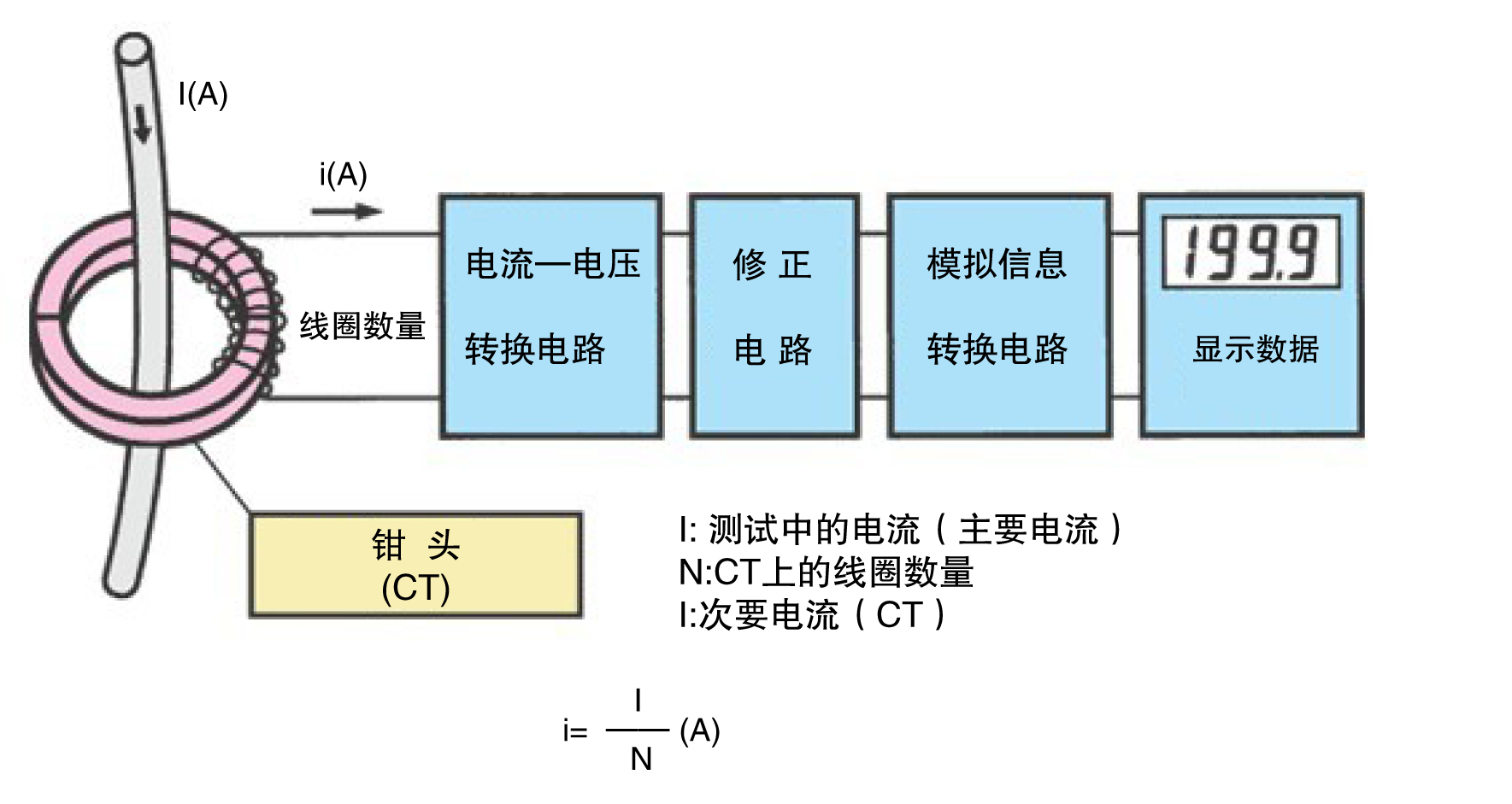 通常情况下交流钳形电流表的操作是遵循CT原则,CT原则常用于电流通过导体获得磁通量。假设通过导体的电流为主要电流,我们能通过钳头的次级线圈(次级线圈与被测物体的电路相连)产生的电磁感应获得一个与主要电流成比例的电流。这能使我们得到交流电流的读书(在使用数字式钳形电流表)