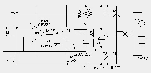 采用电流信号的原因是不容易受干扰。并且电流源内阻无穷大,导线电阻串联在回路中不影响精度,在普通双绞线上可以传输数百米。上限取20mA是因为防爆的要求:20mA的电流通断引起的火花能量不足以引燃瓦斯。下限没有取0mA的原因是为了能检测断线:正常工作时不会低于4mA,当传输线因故障断路,环路电流降为0。常取2mA作为断线报警值。 电流型变送器将物理量转换成4~20mA电流输出,必然要有外电源为其供电。最典型的是变送器需要两根电源线,加上两根电流输出线,总共要接4根线,称之为四线制变送器。当然,电流输出可以与电源公用一根线(公用VCC或者GND),可节省一根线,称之为三线制变送器。